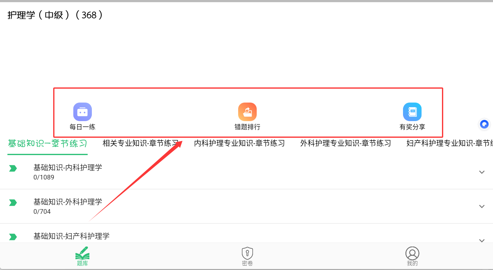 1、打开软件进入题库页,能看到每日一练、错题排行和科目章节练习等入口哦。