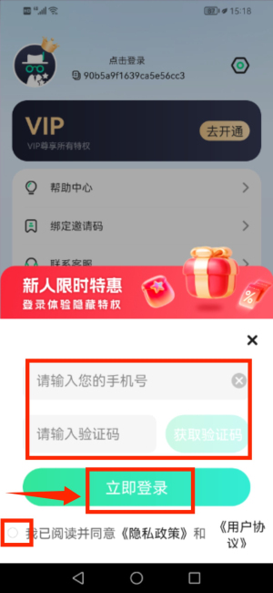 2、输入手机号及验证码并同意协议,完成登录验证。
