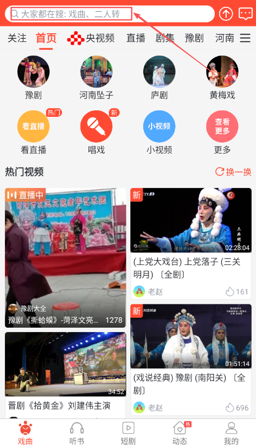 2、使用顶部的搜索功能输入具体剧种名称如“黄梅戏”或节目名如“梨园春”,即可快速找到相关资源进行边搜边看。