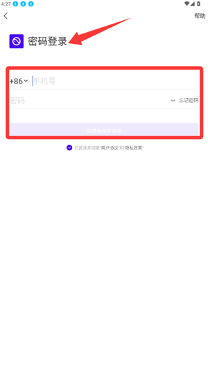 1、在密码登录页输入手机号与密码,勾选协议后登录。