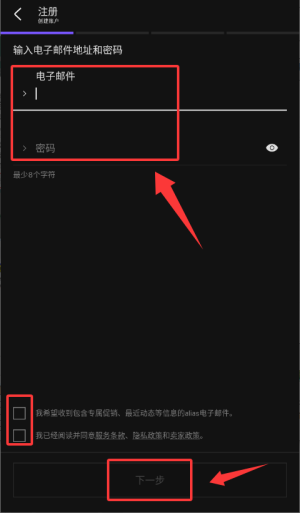 3、输入邮箱与密码并同意协议,继续完成注册。