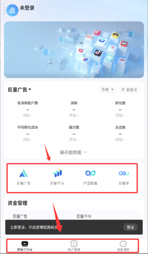 3、于主界面选择巨量广告或营销工作台等功能使用。