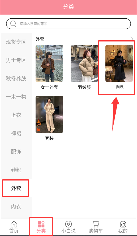 2、进入分类页面选择外套分类后,点击毛呢选项查看对应品类商品。