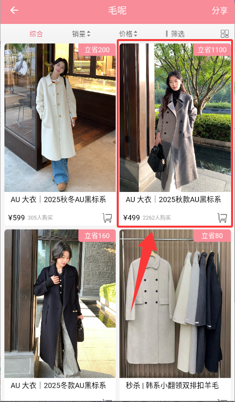 3、在毛呢商品列表中可选择目标商品,进行查看或加购操作。