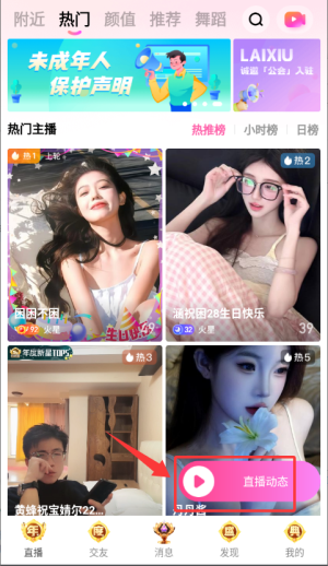 3、登录后进入主界面,点击红色直播动态按钮即可查看相关内容。